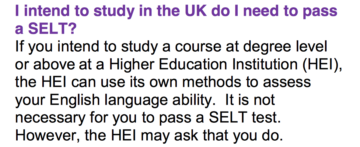 ここにもある通り、HEIに登録されている機関が英語の評価方法を決めることができ、その場合はSELT(IELTS for UKVI等)を受験する必要はない旨が書かれています。