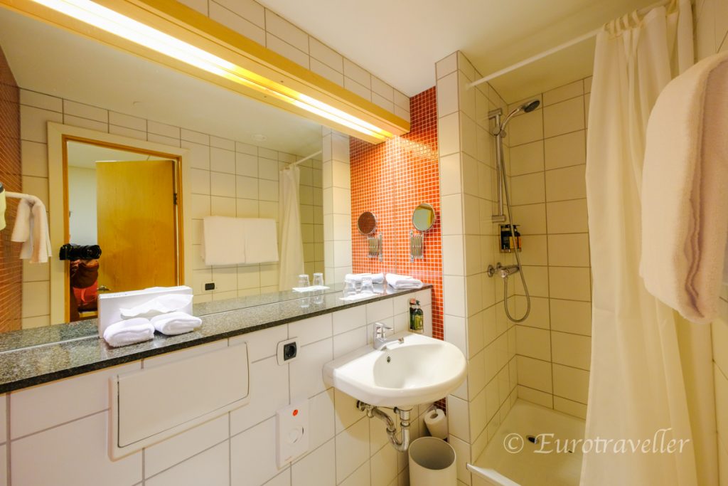 シャワールームはヨーロッパでは標準的な設備。バスタブはありませんでしたが、明るく広々としており大きな鏡が設置されています。