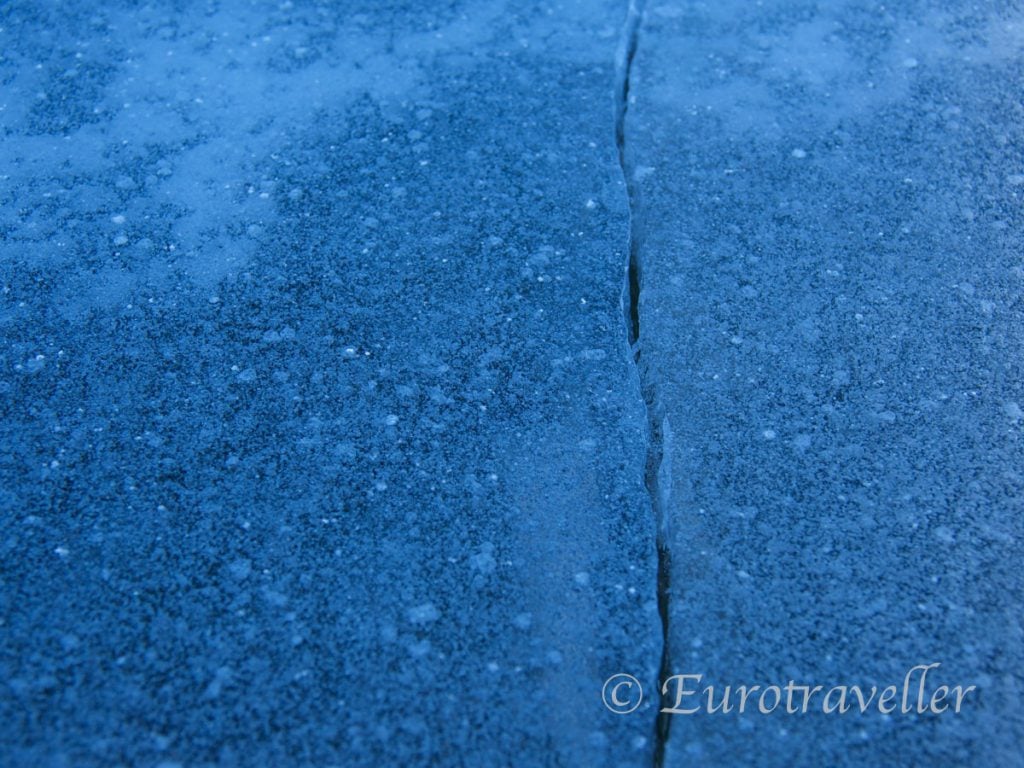 よく見ると氷の上に亀裂が。といっても氷の厚さはまだ50cm以上あり歩く分には安全です。