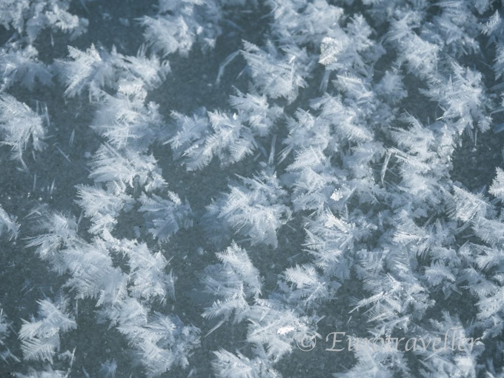 そんなこともあって大気中の湿度が凍結し、非常に大きな霜が落ち葉のように地面からはえる現象もみられます。氷の結晶がはっきりと見える神秘的な光景。