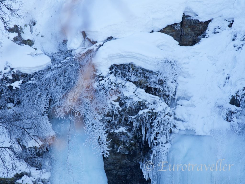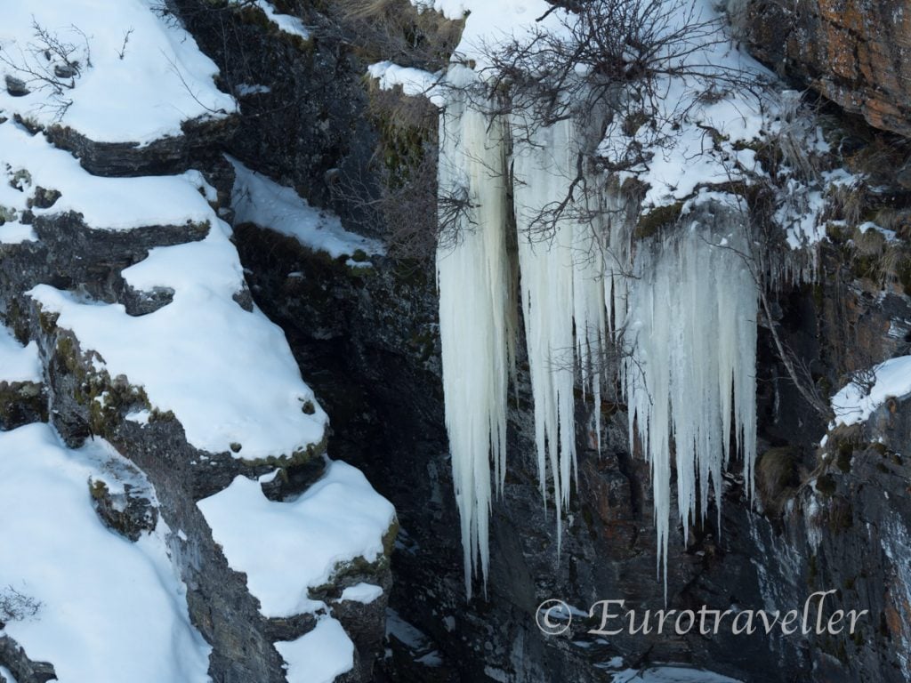 小川の周囲には水が流れる音が。滝も見事に凍ってはいますが、氷の裏側で雪解け水が流れているようでした。