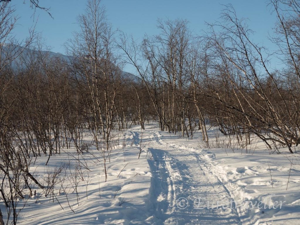散策路の奥に見えているのがトーネ湖 Torneträsk。冬季は気温が-20度以下になるためもちろん湖も凍っています。