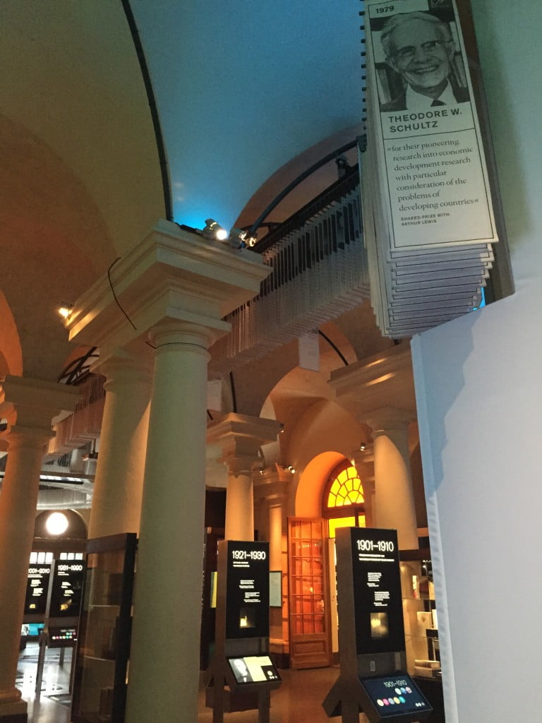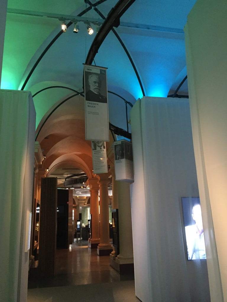 ノーベル博物館内部の写真をよーくご覧ください。天井からパネルがたくさんぶら下がっているのがわかりますか?実はこのパネル1枚1枚が過去のノーベル賞受賞者となっています。