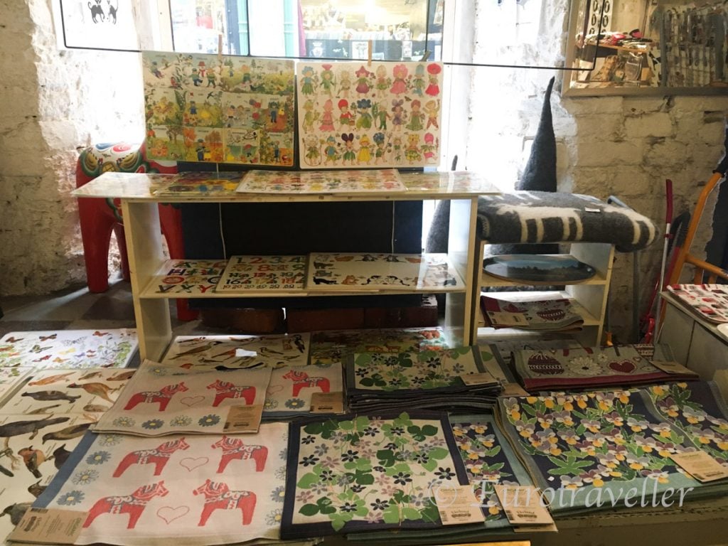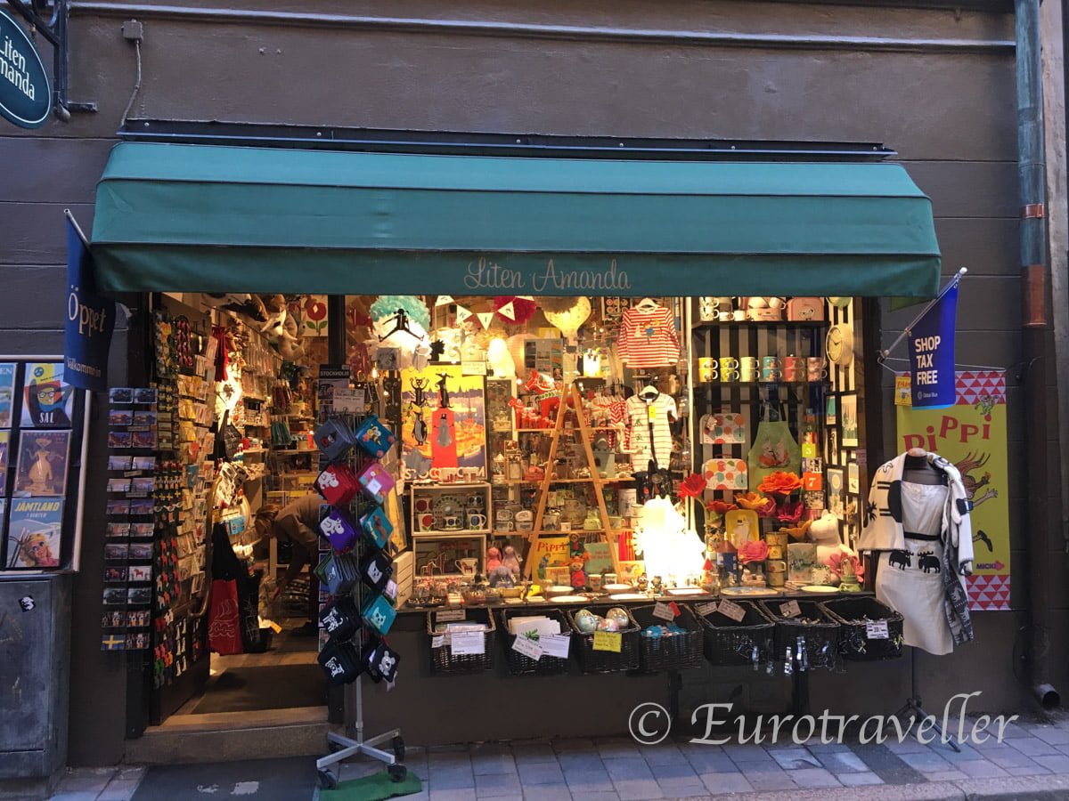 ダーラナホースの置物などの伝統的な北欧雑貨はもちろん、ムーミン、長靴下のピッピグッズ等、その品揃えの多さはガムラスタン随一と言えるほど。