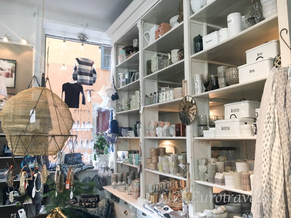 キッチン雑貨から洋服、アクセサリーまでを取り揃えているお店。北欧柄モチーフの陶器やキッチン雑貨類が真っ白なアンティーク調の重厚な棚にセンス良く並べられているのが印象的です。