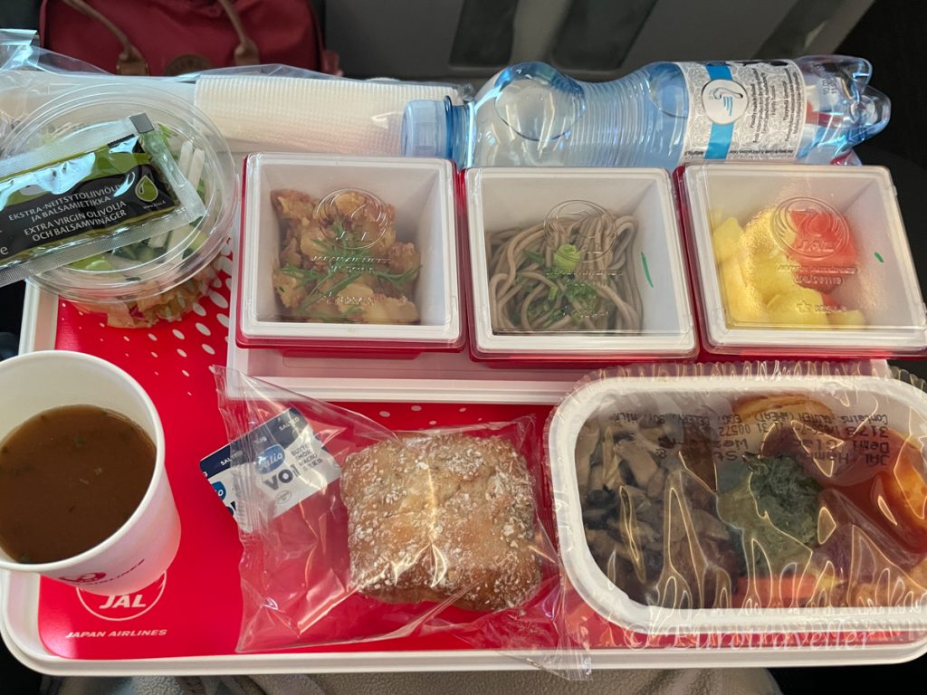 離陸後まず1回目の機内食が配られました。わずか18人の搭乗客とは言え、いつも通り和食・洋食の2種類からの選択。