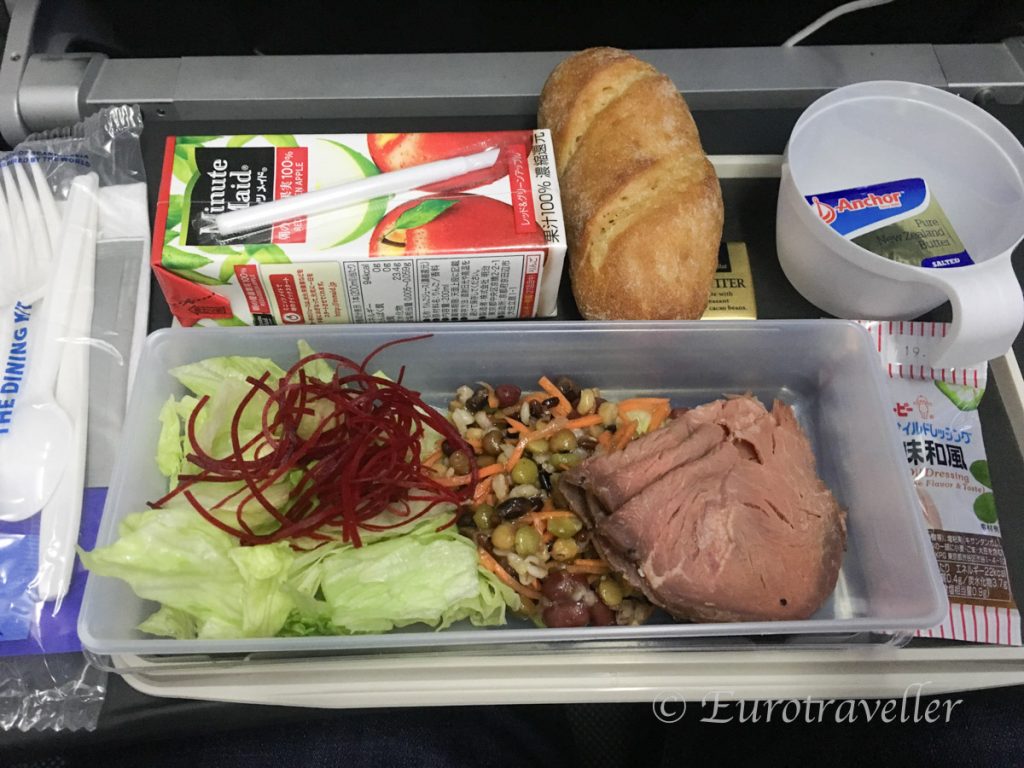 ドリンクサービスの後は1回目の食事が配布されます。他社のように肉や魚が選択できるというものはなく、エコノミークラスの食事は1種類。好き嫌いがあっても選択の自由はありません。