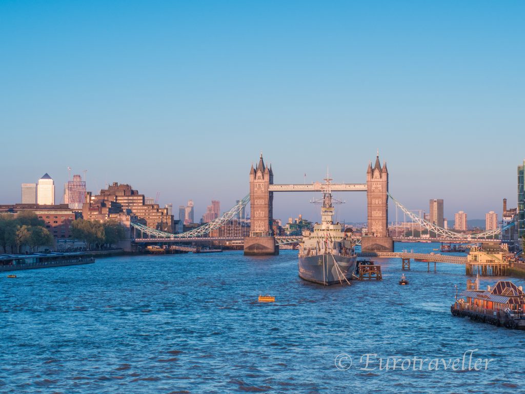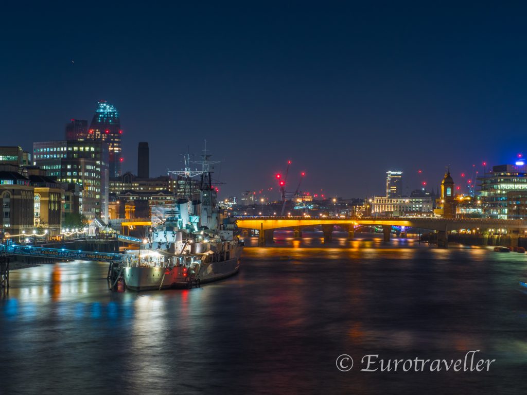 40−150のズームがどの程度のものなのかをここで紹介。ロンドンのタワーブリッジ前に停泊するベルファスト号に注目してください。