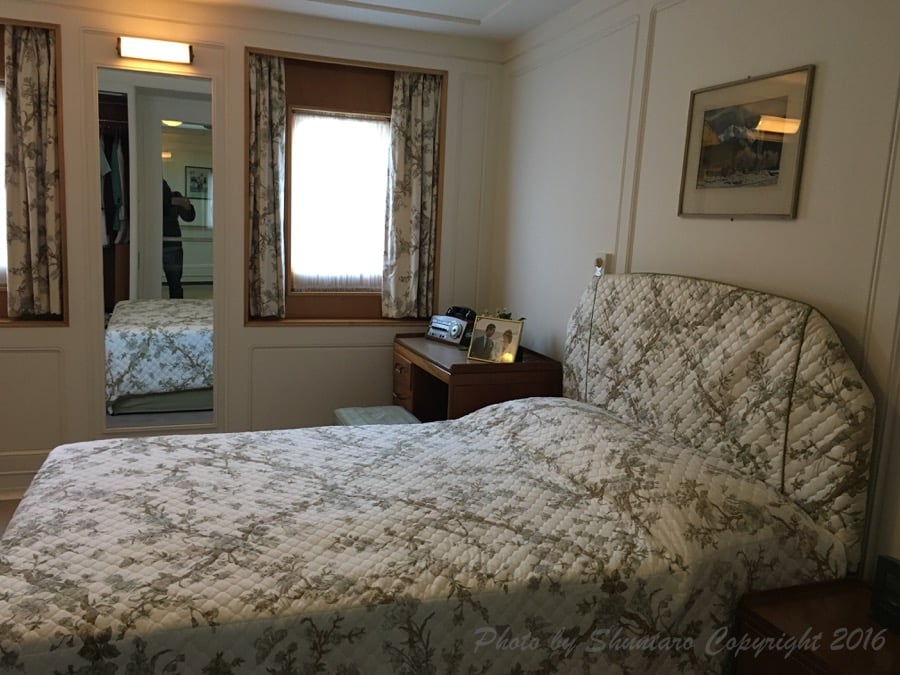 女王の部屋と聞くと、超豪華絢爛な部屋を想像しますが、やはりそこは船上ということもあってかなりこじんまり。ベットのサイズもシングルで最低限の設備でした。