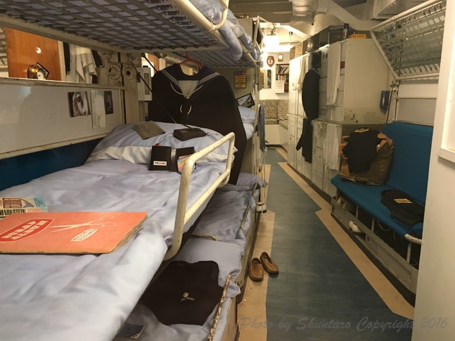 非常に狭い船室に3段ベッドが敷き詰められていました。ちなみに船長クラスは個室、中級指揮官レベルは二人部屋、とやはりこちらも階級が大きく生活の質を左右します。